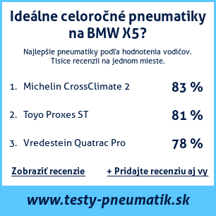 Ak máte vlastný web s tematikou automobilov, alebo ste dodávateľom pneumatík, môžete na svoj web umiestniť našu plaketu s hodnotením pneumatík vhodných pre vozidlo BMW X5: test pneumatík na BMW X5 [png] ![]()