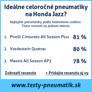 Ak máte vlastný web s tematikou automobilov, alebo ste dodávateľom pneumatík, môžete na svoj web umiestniť našu plaketu s hodnotením pneumatík vhodných pre vozidlo Honda Jazz: test pneumatík na Honda Jazz [png] ![]()