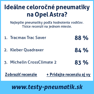 Ak máte vlastný web s tematikou automobilov, alebo ste dodávateľom pneumatík, môžete na svoj web umiestniť našu plaketu s hodnotením pneumatík vhodných pre vozidlo Opel Astra: test pneumatík na Opel Astra [png] ![]()