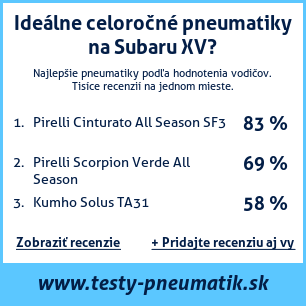 Ak máte vlastný web s tematikou automobilov, alebo ste dodávateľom pneumatík, môžete na svoj web umiestniť našu plaketu s hodnotením pneumatík vhodných pre vozidlo Subaru XV: test pneumatík na Subaru XV [png] ![]()