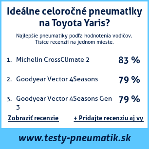 Ak máte vlastný web s tematikou automobilov, alebo ste dodávateľom pneumatík, môžete na svoj web umiestniť našu plaketu s hodnotením pneumatík vhodných pre vozidlo Toyota Yaris: test pneumatík na Toyota Yaris [png] ![]()