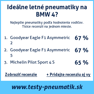 Ak máte vlastný web s tematikou automobilov, alebo ste dodávateľom pneumatík, môžete na svoj web umiestniť našu plaketu s hodnotením pneumatík vhodných pre vozidlo BMW 4: test pneumatík na BMW 4 [png] ![]()