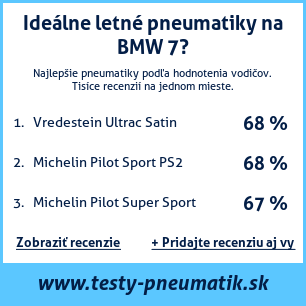 Ak máte vlastný web s tematikou automobilov, alebo ste dodávateľom pneumatík, môžete na svoj web umiestniť našu plaketu s hodnotením pneumatík vhodných pre vozidlo BMW 7: test pneumatík na BMW 7 [png] ![]()