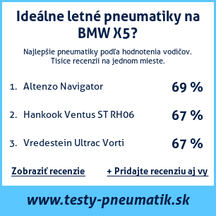 Ak máte vlastný web s tematikou automobilov, alebo ste dodávateľom pneumatík, môžete na svoj web umiestniť našu plaketu s hodnotením pneumatík vhodných pre vozidlo BMW X5: test pneumatík na BMW X5 [png] ![]()