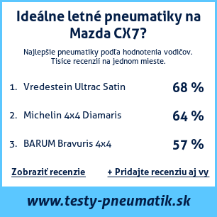 Ak máte vlastný web s tematikou automobilov, alebo ste dodávateľom pneumatík, môžete na svoj web umiestniť našu plaketu s hodnotením pneumatík vhodných pre vozidlo Mazda CX7: test pneumatík na Mazda CX7 [png] ![]()