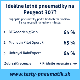 Ak máte vlastný web s tematikou automobilov, alebo ste dodávateľom pneumatík, môžete na svoj web umiestniť našu plaketu s hodnotením pneumatík vhodných pre vozidlo Peugeot 307: test pneumatík na Peugeot 307 [png] ![]()