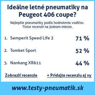 Ak máte vlastný web s tematikou automobilov, alebo ste dodávateľom pneumatík, môžete na svoj web umiestniť našu plaketu s hodnotením pneumatík vhodných pre vozidlo Peugeot 406 coupe: test pneumatík na Peugeot 406 coupe [png] ![]()