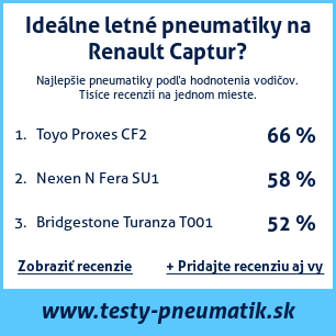 Ak máte vlastný web s tematikou automobilov, alebo ste dodávateľom pneumatík, môžete na svoj web umiestniť našu plaketu s hodnotením pneumatík vhodných pre vozidlo Renault Captur: test pneumatík na Renault Captur [png] ![]()