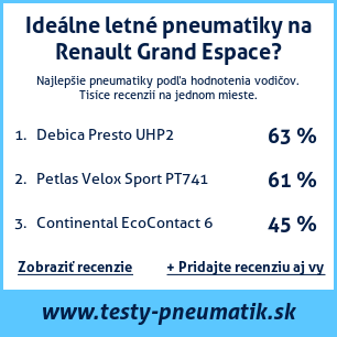 Ak máte vlastný web s tematikou automobilov, alebo ste dodávateľom pneumatík, môžete na svoj web umiestniť našu plaketu s hodnotením pneumatík vhodných pre vozidlo Renault Grand Espace: test pneumatík na Renault Grand Espace [png] ![]()