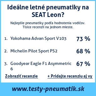 Ak máte vlastný web s tematikou automobilov, alebo ste dodávateľom pneumatík, môžete na svoj web umiestniť našu plaketu s hodnotením pneumatík vhodných pre vozidlo SEAT Leon: test pneumatík na SEAT Leon [png] ![]()