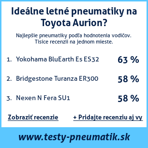 Ak máte vlastný web s tematikou automobilov, alebo ste dodávateľom pneumatík, môžete na svoj web umiestniť našu plaketu s hodnotením pneumatík vhodných pre vozidlo Toyota Aurion: test pneumatík na Toyota Aurion [png] ![]()
