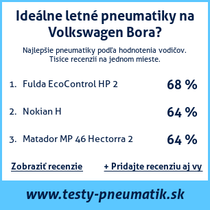 Ak máte vlastný web s tematikou automobilov, alebo ste dodávateľom pneumatík, môžete na svoj web umiestniť našu plaketu s hodnotením pneumatík vhodných pre vozidlo Volkswagen Bora: test pneumatík na Volkswagen Bora [png] ![]()