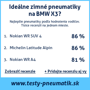 Ak máte vlastný web s tematikou automobilov, alebo ste dodávateľom pneumatík, môžete na svoj web umiestniť našu plaketu s hodnotením pneumatík vhodných pre vozidlo BMW X3: test pneumatík na BMW X3 [png] ![]()