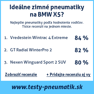 Ak máte vlastný web s tematikou automobilov, alebo ste dodávateľom pneumatík, môžete na svoj web umiestniť našu plaketu s hodnotením pneumatík vhodných pre vozidlo BMW X5: test pneumatík na BMW X5 [png] ![]()